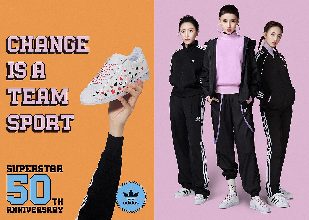 今年,Superstar滿50歲了,adidas Originals破天荒集結全球音樂、時尚、運動和藝術人士,組成CHANGE IS A TIME SPORT超大咖團隊拍攝形象影片,傳達即使來自不同領域,只要團隊合作,就能再創經典!前所未有的夢幻團隊一致穿上Superstar,彷彿拉回時空到1970年的校園,詮釋即使從一人開始,也需要透過團體力量才能有所改變。官方形象更邀請楊冪、Angelababy來演繹,韓國超人氣女團BLACKPINK也在其中,Angelababy穿上2月新款情人節愛心Superstar,搭配運動褲和粉紫色高領衫,故意拉高一邊的褲管,展現又酷又甜的復古嘻哈印象。