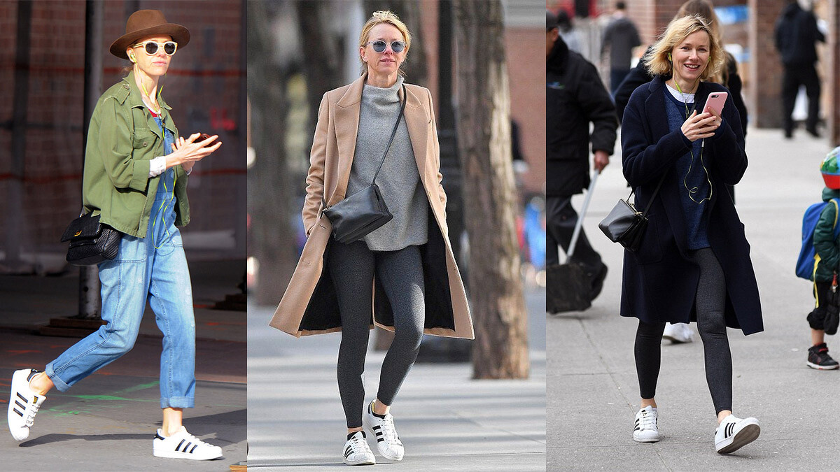 高雅路線的女星Naomi Watts,則充分展現了Superstar的百搭性,可以很輕鬆俏皮的搭配吊帶褲,或搭正式的大衣也不違和。