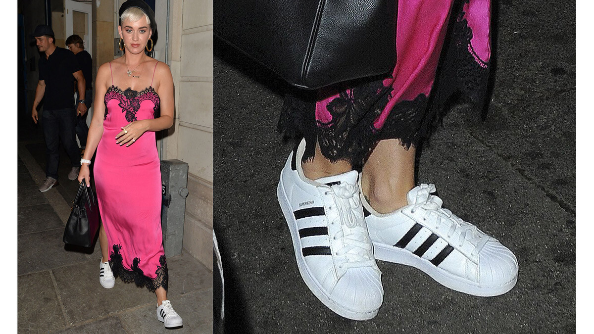 Katy Perry搭配Superstar的方式更讓M編大讚太厲害~竟然跟蕾絲洋裝混搭?如此衝突的風格在她身上,完全貫徹Superstar叛逆又反骨的精神。