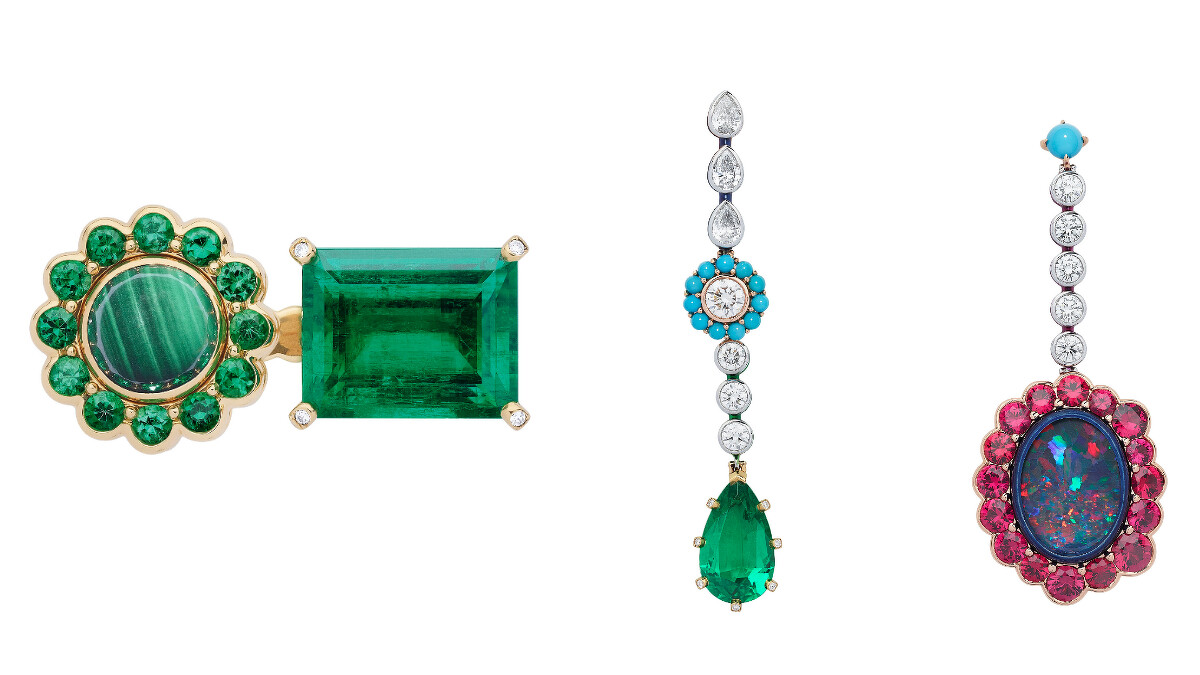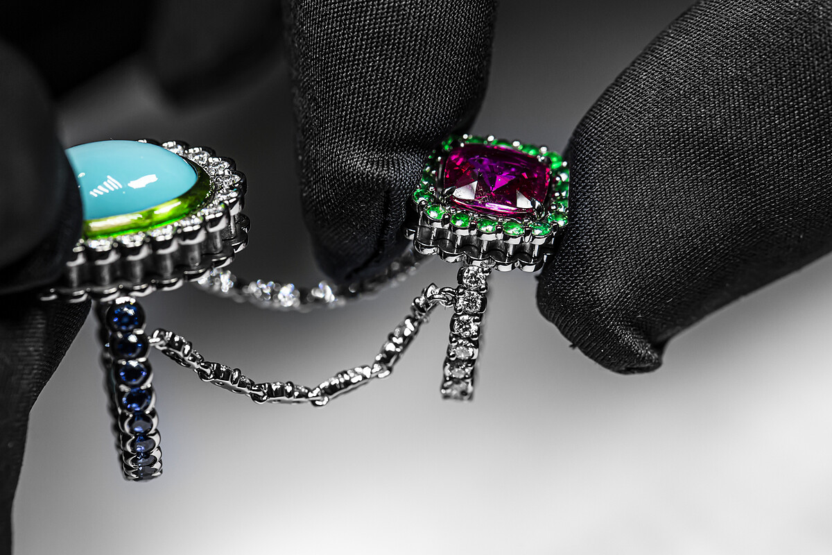 全系列珠寶幾乎以「不對稱」和「雙主石」主題貫穿,透過細膩的色彩組合和幾何圖形的拼接,展現出極度迷人的藝術氣息,也提升了配戴的層次,尤其是不少作品甚至正反面都各有巧思、不盡相同,充分展現個性之餘,也是集珠寶工藝之大成的最佳詮釋。