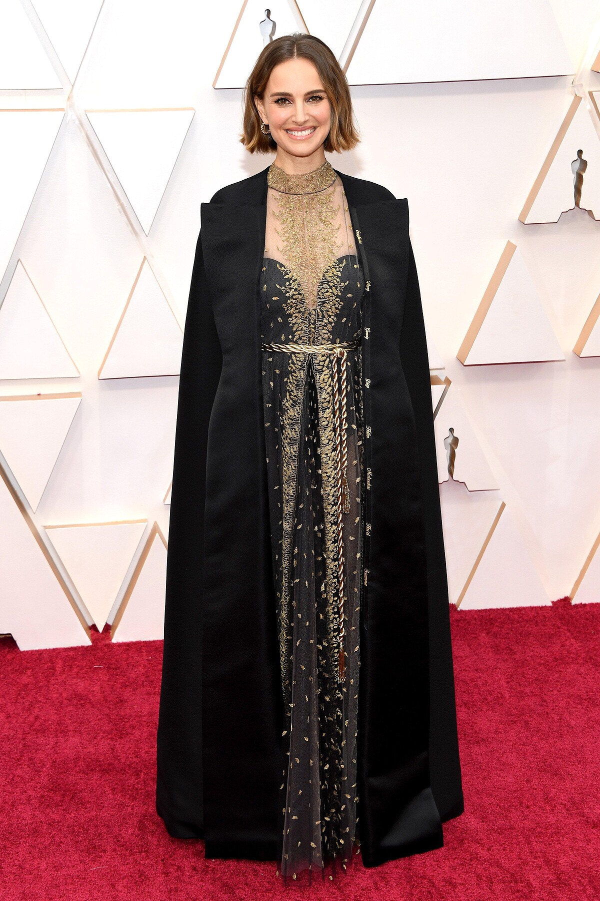 影后娜塔莉波曼無疑是奧斯卡紅毯最美代表,人美心更美,用服裝為女性電影工作者發聲。她選穿DIOR 2020春夏系列高級訂製服現身,別於秀場上的透紗裸膚設計,她的禮服加了黑色心型領的內襯,反差感的色系將紗質禮服上的金色小麥圖騰,襯托得更加出彩。她並搭配黑色長斗蓬,且在邊緣上繡著多位女性導演的名字力挺,包含《她們》導演葛莉塔潔薇(Greta Gerwig)等。