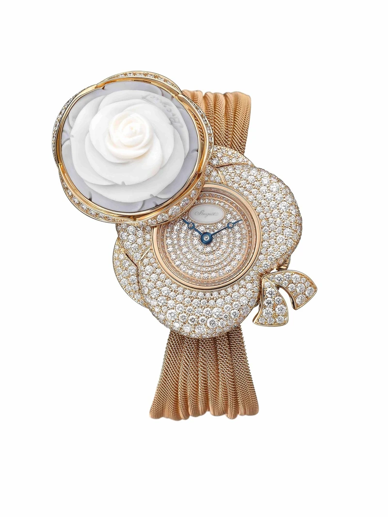 皇后的秘密高級珠寶系列以法國瑪麗安東尼皇后的故居小堤亞儂宮所種植的玫瑰花為創作靈感,透過不同的手工藝來展現品牌精湛的製錶藝術,最迷人的當屬貝殼浮雕玫瑰花,隱約綻放的美像是訴說著皇后摯愛的秘密。這只神秘腕錶作品錶殼以18K玫瑰金鑄造,飾以手工雕刻的花型貝殼浮雕裝飾,及鋪鑲432圓形鑽石的18K玫瑰金花結,推開旋軸後便可以讀取時間。錶盤凸緣鑲有48顆鑽石,鍍銀18K金錶盤則以傳統方式鋪鑲以116顆圓形鑽石,12時位飾以寶璣圓形母貝徽章,並採用針尖鏤空寶璣指針。