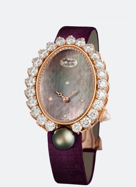 為了向拿破崙的第一任妻子約瑟芬皇后致意而製作了這只 Perles Impériale 皇后的珍珠高級珠寶鑽錶,早在1800年,約瑟芬皇后曾購買了一款編號611的小型觸摸懷錶,配以藍色琺瑯錶殼與鑽石裝飾錶圈,Perles Impériale腕錶以其為靈感,呈現更精緻的珠寶鑲嵌技術,錶圈鑲以圓形鑽石凸顯品牌指標性的鵝蛋形錶殼,12點方向更鑲飾一枚日本大溪 AKOYA 珍珠,華美迷人。偏心錶盤的3、6、9及12點鐘方向鑲有總重6克拉的鑽石時標, 18K玫瑰金錶殼搭配大溪地貝母面盤,充滿巧思與慧黠。