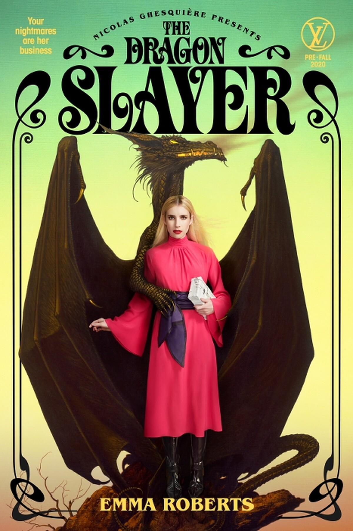 由主演《美國恐怖故事》、《驚聲尖叫4》的艾瑪·蘿絲·羅伯茨Emma Roberts演繹的《屠龍記》海報,她化身為美麗的主角,身上的包款有如招喚神秘力量的魔法書般存在感強烈,完美掌握了奇幻小說的精髓。
