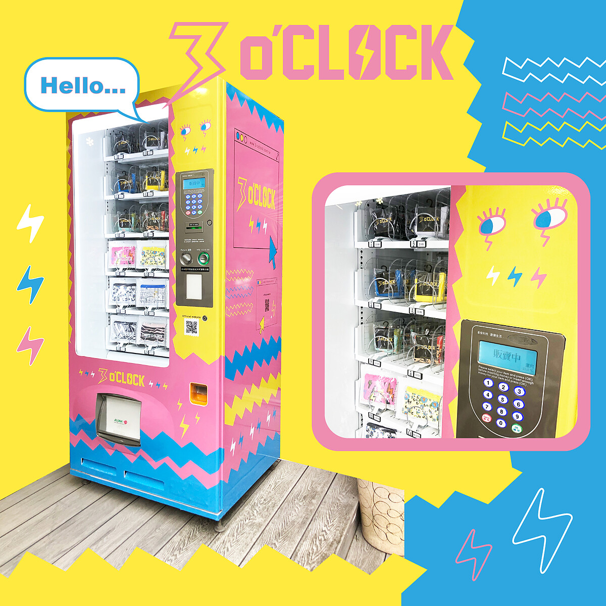 3 o’CLOCK信義旗艦店以「快餐店」風格裝潢,從「點餐櫃檯」(結帳櫃檯)到「冰淇淋區」(襪子區)都很有FU,喜歡拍照的人逛街時,肯定要拍個幾張做紀念。此外,3 o’CLOCK更推出全台首座內褲、襪子販賣機,24小時不打烊,隨時隨地都能添購新行頭。像現在防疫至上的時刻不便外出,還可以選擇網購送到家,讓大家在家也能美美的喔!