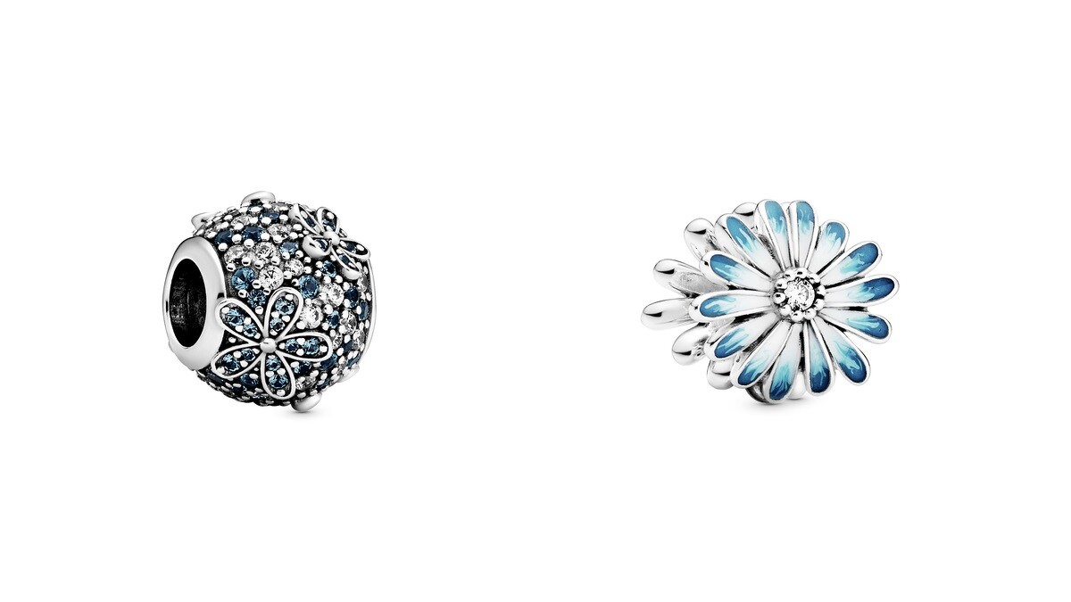 除了粉嫩色系外,Pandora運用引以為傲的手工繪製技術,將小雛菊染上藍色、白色漸層暈染的片片花瓣,不同於粉嫩色系給人的夢幻感,清新藍的小雛菊更多了輕快的活力。