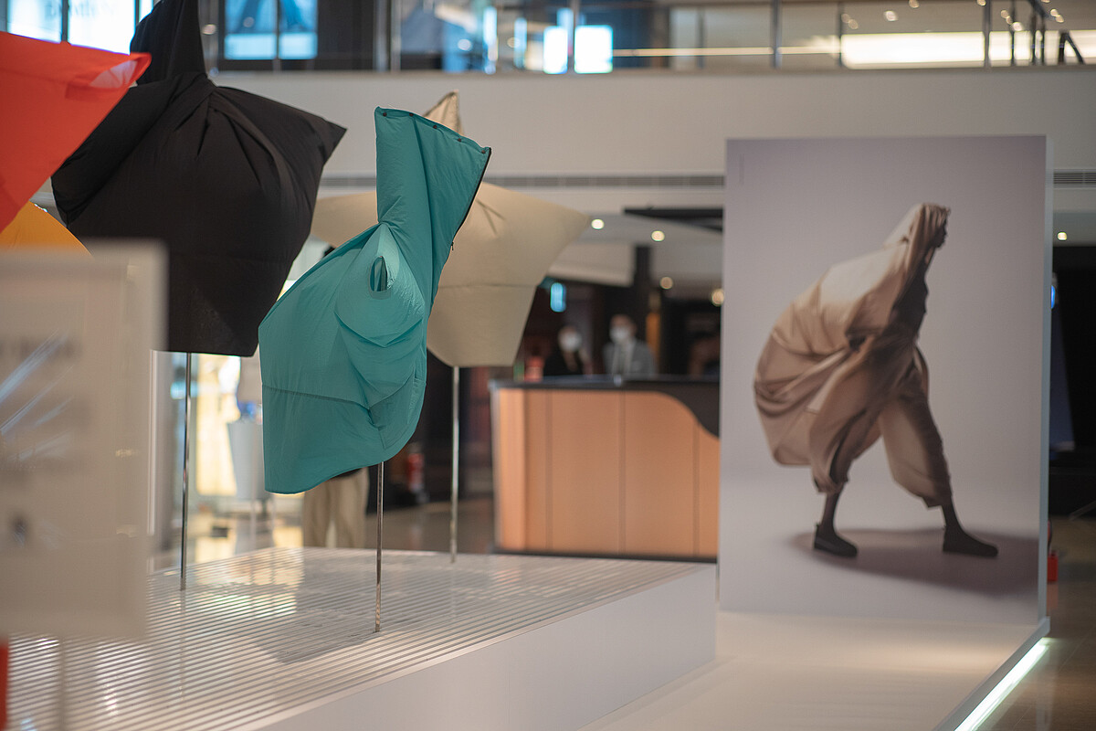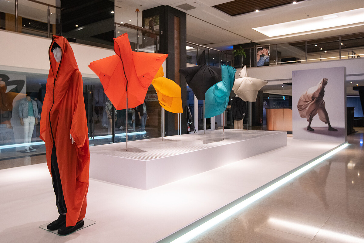 為歡慶新開幕,ISSEY MIYAKE在新店獨家販售新任設計師近藤悟史AIR系列作品,該系列以全新視角詮釋「一塊布」妝點在身與輕盈服貼感,帶給人的喜悅。為了讓顧客們更熟悉這個概念,更特別在專賣店旁做小型展覽,以強風吹拂搭配AIR系列服裝,讓大家感受AIR系列的輕盈。