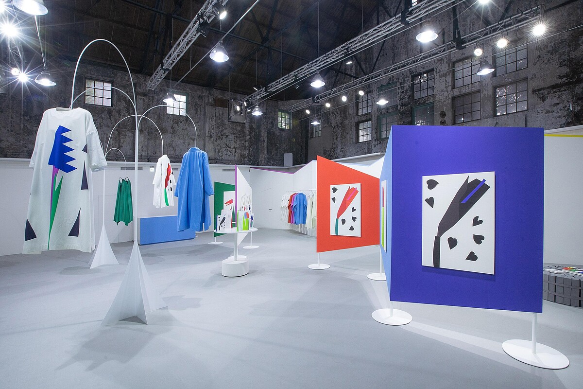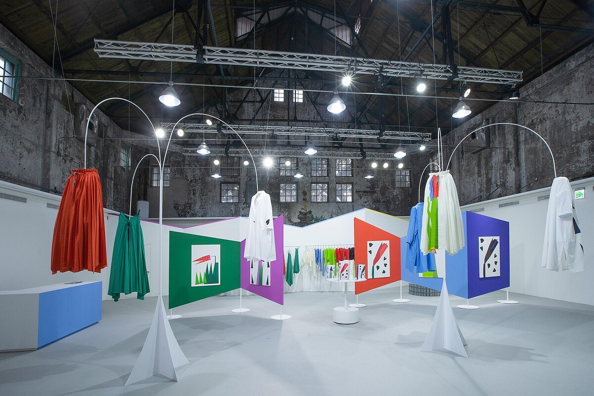 整個展場空間以純淨的白色為基底,點綴上鮮明活潑的色調,可以窺見洋溢著活力與充滿律動感的線條之美,就像將畫作揮灑在純白畫布上一般,空間中充滿了不設限的藝術氣息。除了系列服裝之外,更將田中一光先生的畫作海報融入在陳列空間中,賦予極其出色藝術結合時尚的美學精神概念,在參觀行走動線中以循序漸進的方式同步了解田中一光系列的故事脈絡。其他如使用環保再生材質打造的座椅,更體現了ISSEY MIYAKE設計到生產整個過程中對於環境保護的重視,在擁有奔放線條的裝置藝術空間中,同時也達成ISSEY MIYAKE堅持「魔鬼藏在細節裡」的生核心精神與品牌概念。