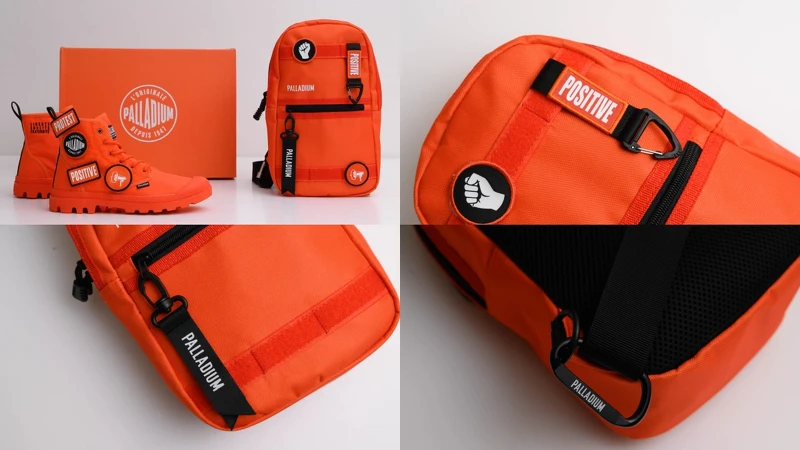 PALLADIUM CHANGE系列靴款推出4色,包含警戒橘、軍事綠、力量黑、自由白;單肩包則有警戒橘、軍事綠、力量黑共3色。