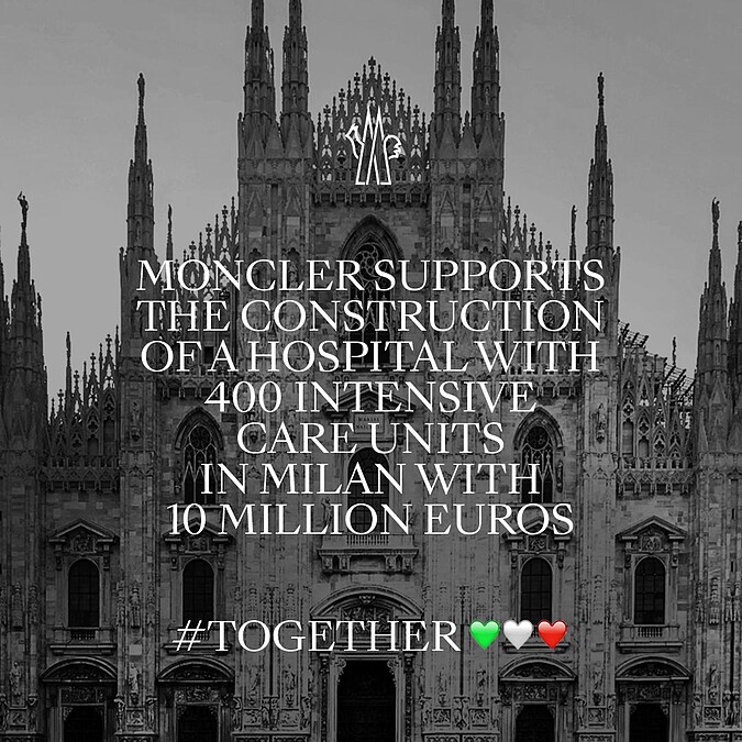 總部設於米蘭的MONCLER(盟可睞),也緊接著宣布捐贈1,000萬歐元(約新台幣4億),用以支持倫巴第(Lombardy)大區正在推進將米蘭國際展覽中心,改建為逾400個ICU重症加護病房的計畫。