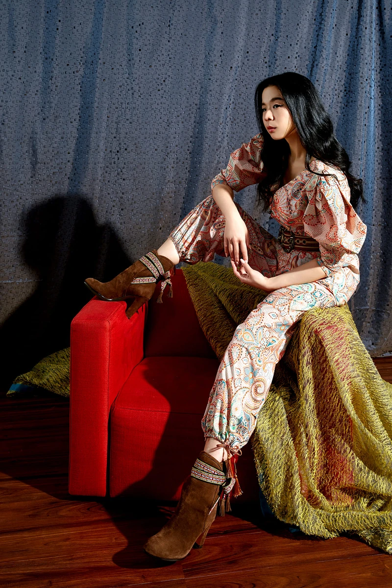 清新多彩的Paisley渦紋圖案,是少見桃心領唯美胸線與蓬蓬袖結合卻不甜膩的優秀設計,搭配上同款束腳長褲,巧妙的以寬版金屬扣皮帶、繫帶流蘇短靴的搶眼配件,佐以服裝本身如褲腳精美流蘇繫帶的細節巧思,完美呈現出柔美與帥氣可如此和諧輝映的模樣。