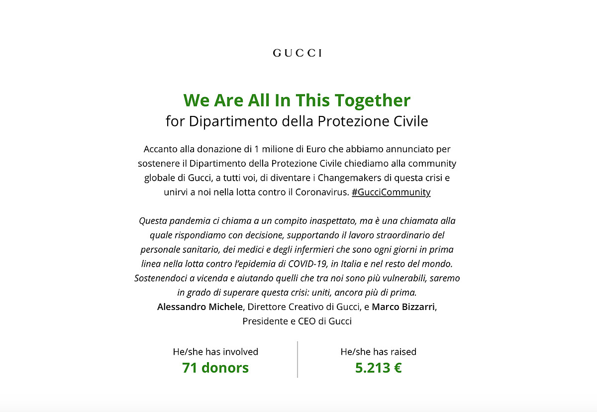 GUCCI將捐出的200萬歐元,其中有100萬歐元與義大利聖保羅聯合商業銀行(San Paolo Banca Intesa)合作為國民防衛部門募款,並透過聯合商業銀行的群眾募資平台專屬網頁讓大家也能捐款。資金將撥予義大利國民防衛部用來強化當地防疫量能,並以為加護病房新增床位為用先,其次強化醫療服務與管理緊急狀態之用。