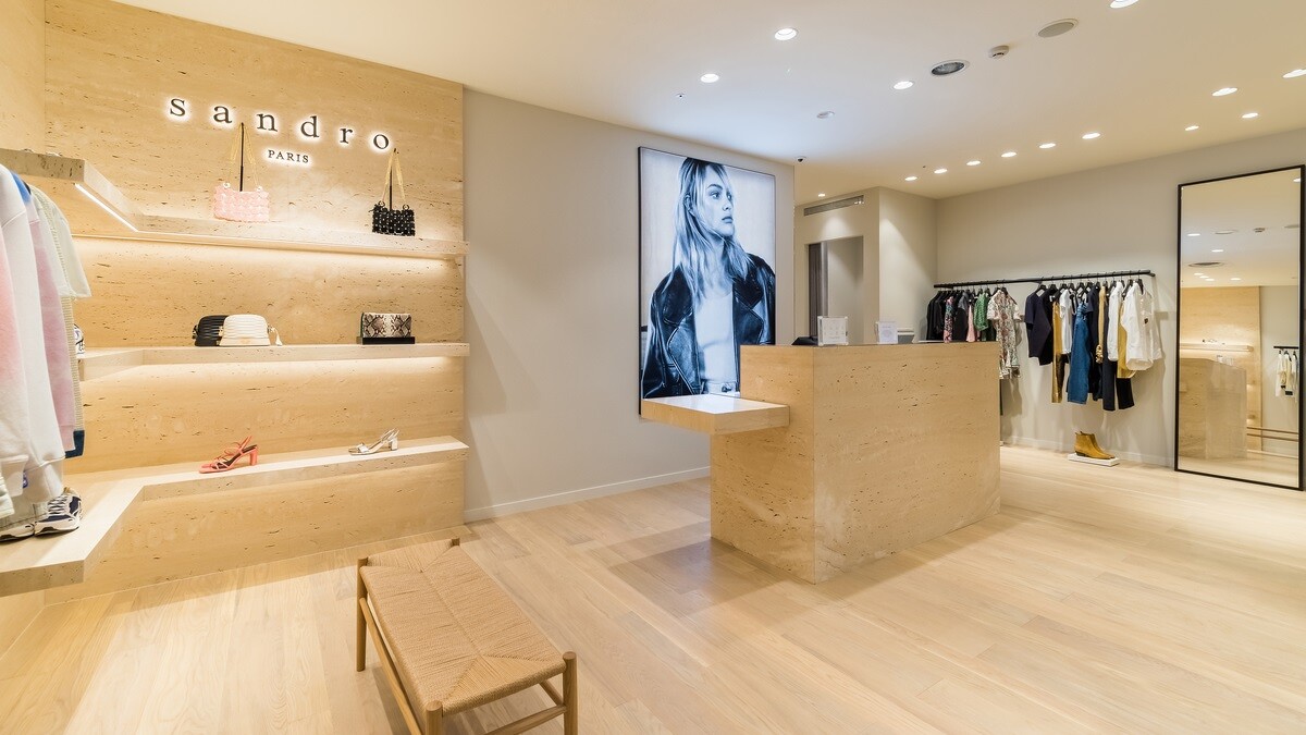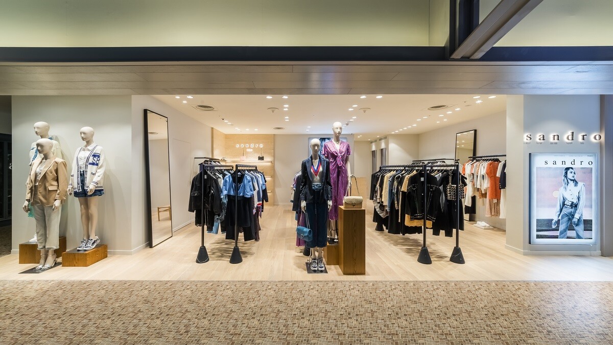繼進駐台北微風信義打造全台首間Sandro專賣店後,2020年3月南下台中新光三越設立第二家專賣店。承襲Sandro一貫的法式優雅,以義大利大理石紋白洞石打造陳列櫃,搭配柔和白牆展現法式簡約氣息,木質地板與傢俱使整體更和諧。