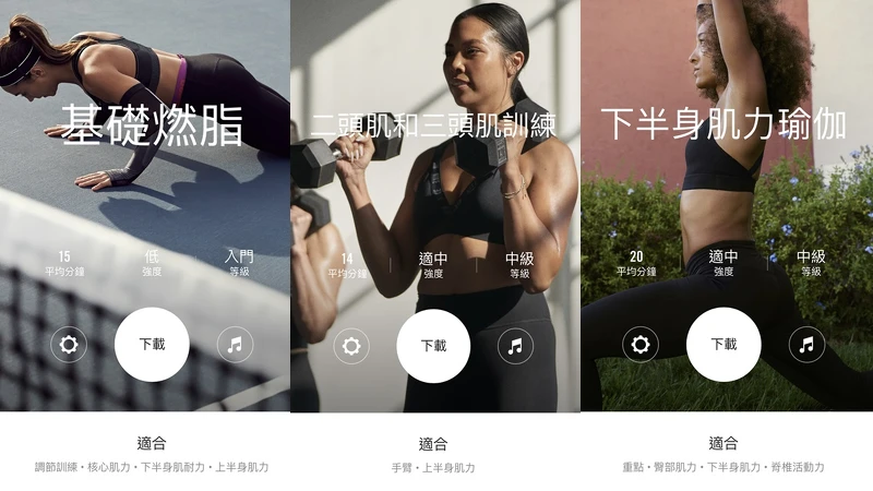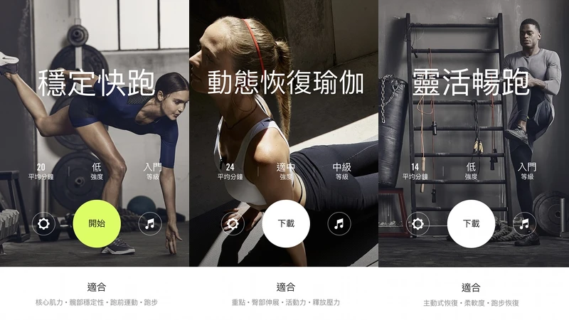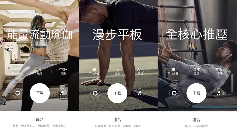 透過世界級Nike Master Trainer所設計的專業運動計畫,能找到適合自己的健身計劃,不論是在家裡、健身房或是戶外道路上,可進行各種不同等級的運動訓練,達成自己設定的健身目標。以下就推薦三種訓練系列:
