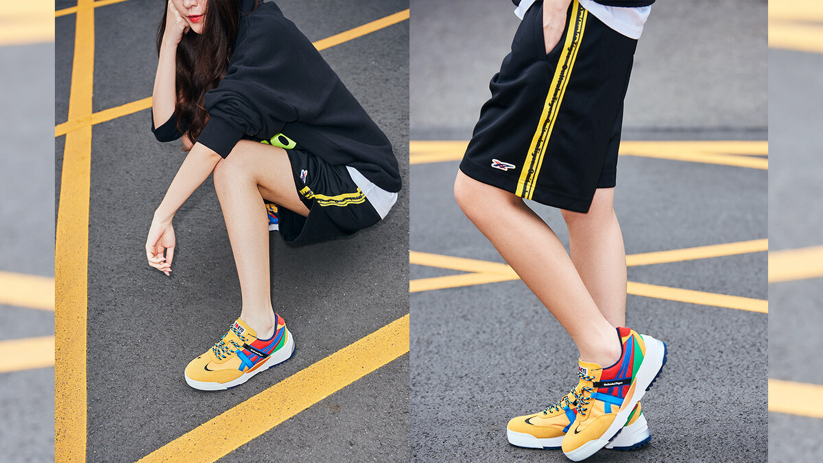 時尚氛圍滿分的螢光色調運動裝束,在春夏有著難以抵抗的強大魅力,搭配上藍紅虎爪線條的白底經典色DELEGATION CHUNK厚底鞋,鮮明吸睛的隨性模樣,即使是輕鬆行走在街頭上也散發出令人不可忽視的強大氣場!