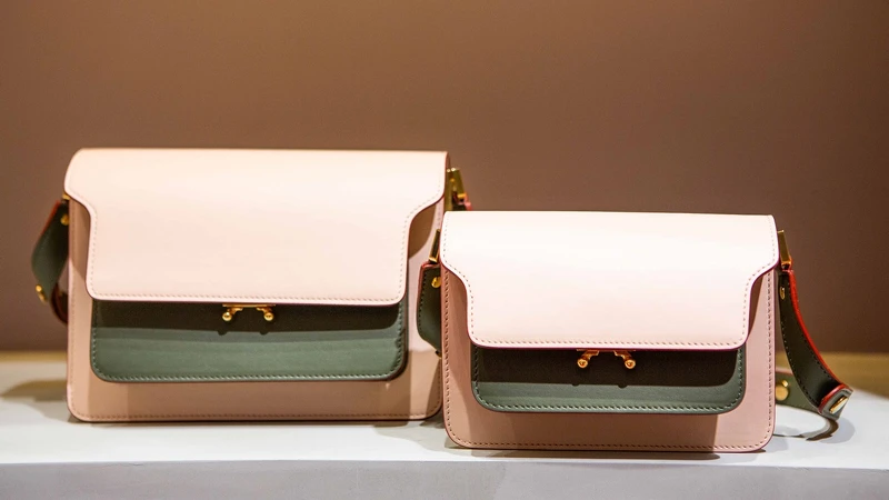 Marni創立之初以女裝、配飾為主要商品,1998年品牌才開啟包包、手袋產品線,2014年Marni推出全新手袋Trunk,沒想到因為出現在楊冪、劉雯私下穿搭行頭中,一夕之間爆紅,成為品牌最熱賣的明星商品。本季Marni延續品牌獨特的撞色風格,Trunk以浪漫粉嫩色系搭上沉穩的墨綠色亮相。