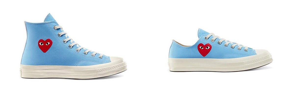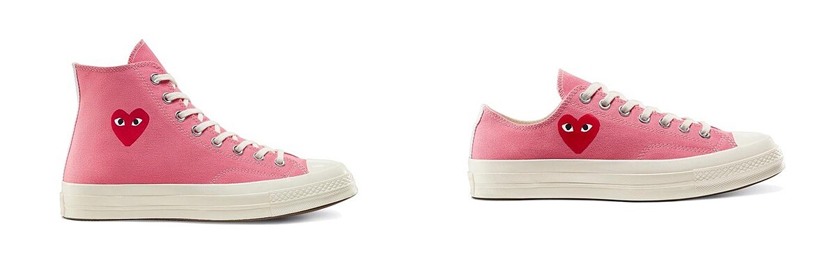 深受年輕一輩喜愛的COMME des GARÇONS PLAY系列,是川久保玲與鬼才藝術家Filip Pagowsk聯手打造的支線系列,標誌性的「紅色愛心圖案」呈現於衣服、鞋履上極具辨識度。這之中也包含與Converse合作的聯名鞋款。