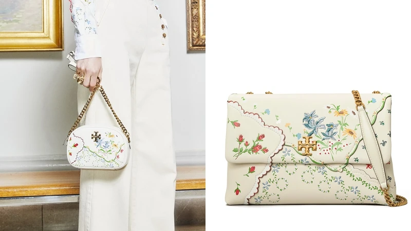 設計師Tory Burch從復古手帕上找尋靈感,上頭細膩的刺繡作為設計概念,以切割小羊皮拼貼,結合刺繡及皮革雕刻等工藝,精細勾勒花卉圖騰,再襯以工筆畫繪製,呈現於方正的Kira肩背口蓋包、橢圓輕巧的Kira相機包及長夾式鍊帶肩背包。Tory Burch刺繡手帕拼接圖紋相機包,NT18,900
