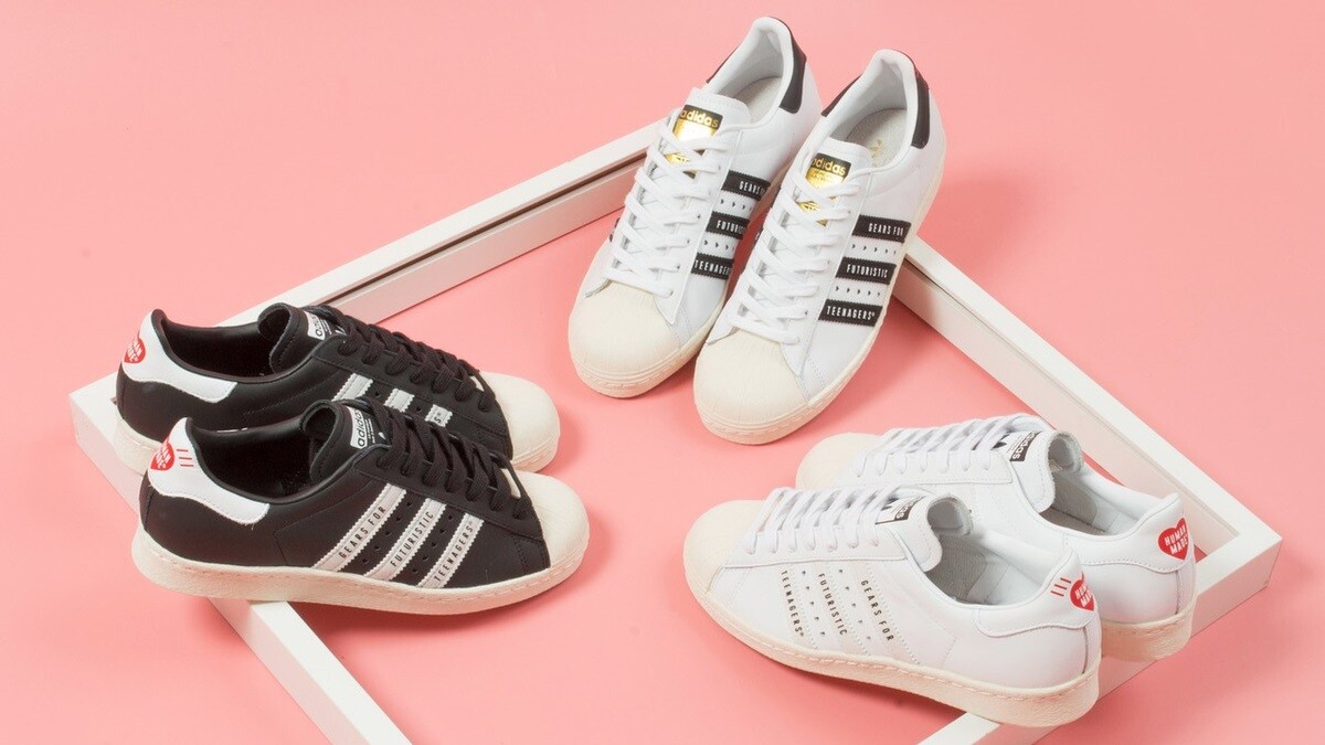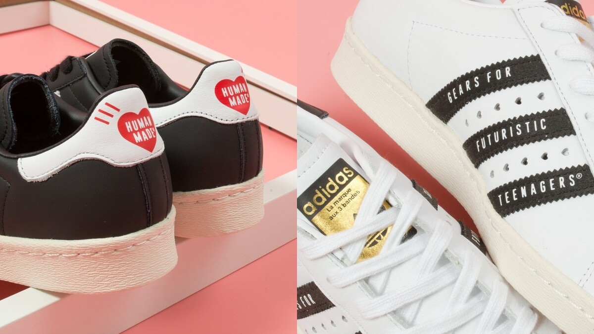 最新攜手日本潮流巨頭Nigo旗下的Human Made,先前雙方已多次聯手,每每發售新作總在短時間內售罄,這回再次合作,選擇adidas Originals明星鞋款Superstar為基型,以Human Made代表性的愛心圖騰融入鞋款設計,將側邊三斜線佈滿迷你鏤空愛心形狀,與品牌代表性文字 “ Gears for Futuristic Teenagers ”,鞋後跟也印上愛心品牌圖案。