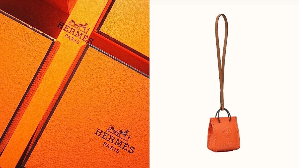 小包風潮延燒至今,許多精品品牌紛紛將自家經典包款推出迷你版本,而愛馬仕也有一款小橘包,這是2020年春夏系列中的Orange系列的Milo小羔羊皮皮包掛飾,外型就跟Hermès的紙袋一模一樣,上頭還壓印著「HERMÈS 24, Faubourg Saint-Honoré, PARIS」的字體及經典Logo。
