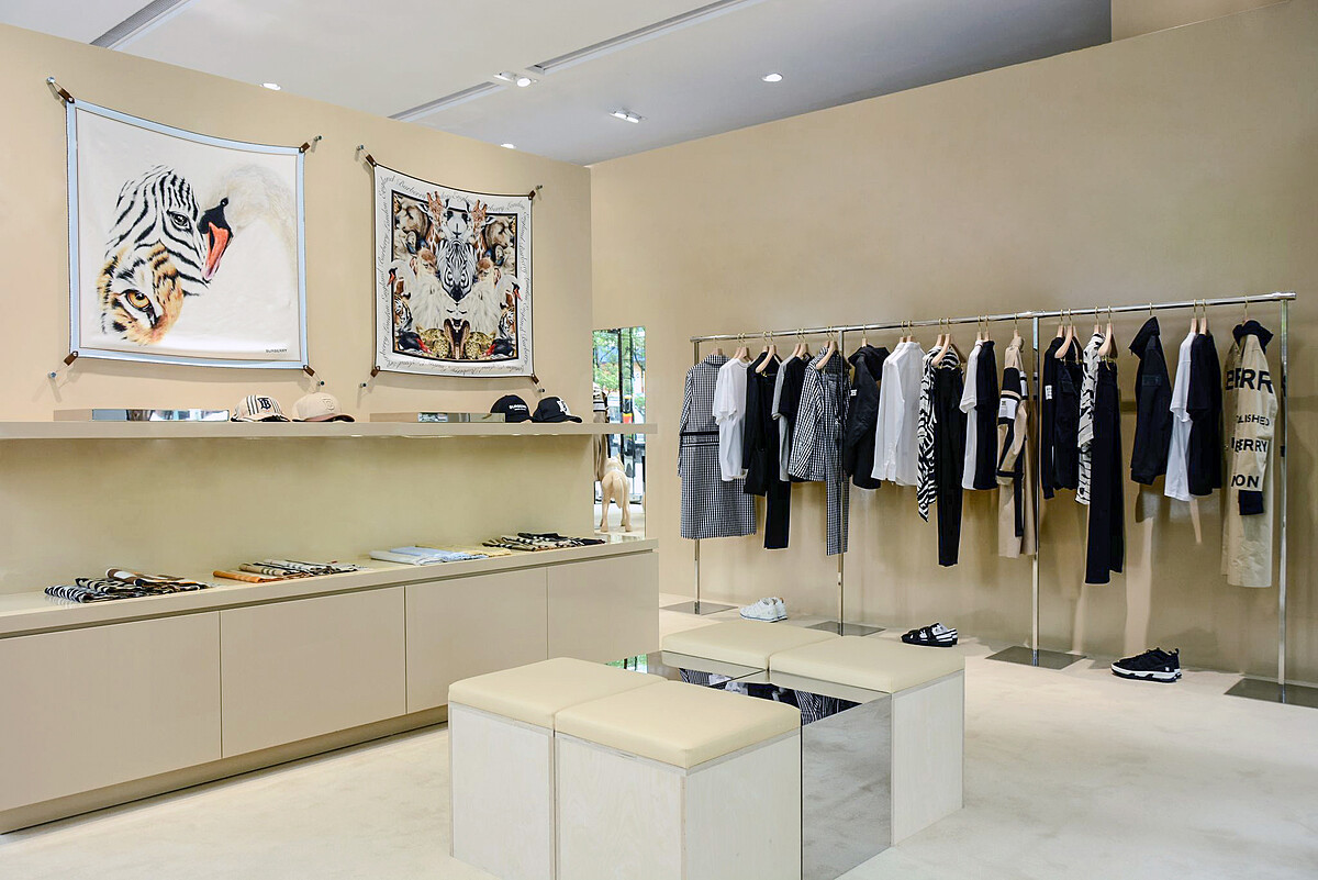 Burberry選在信義遠百開幕的限時概念店就以動物作為主題,一踏進店內,就能看見可愛動物們熱情迎接,更精選斑馬紋服飾、鹿紋包款以及動物印花圍巾等單品陳列,這也是台灣首間加入動物元素的專賣店。此外,限時概念店也搭上大勢溫柔奶茶色,從地毯、牆面到柱子皆不放過。