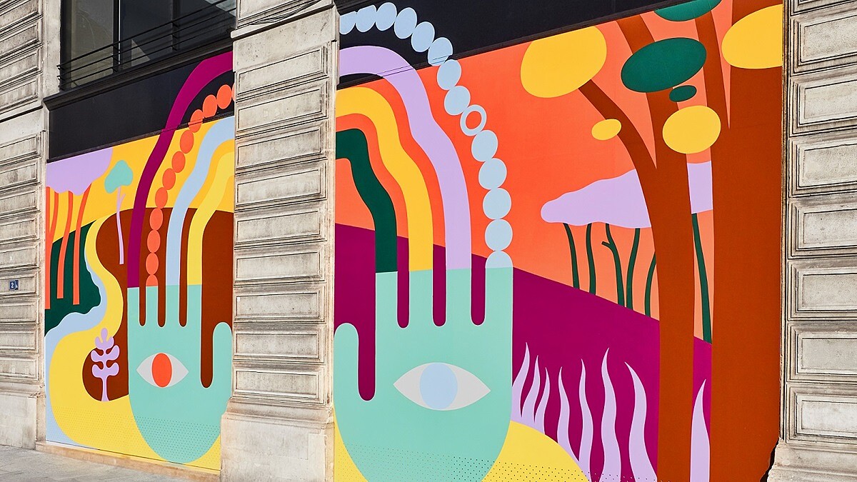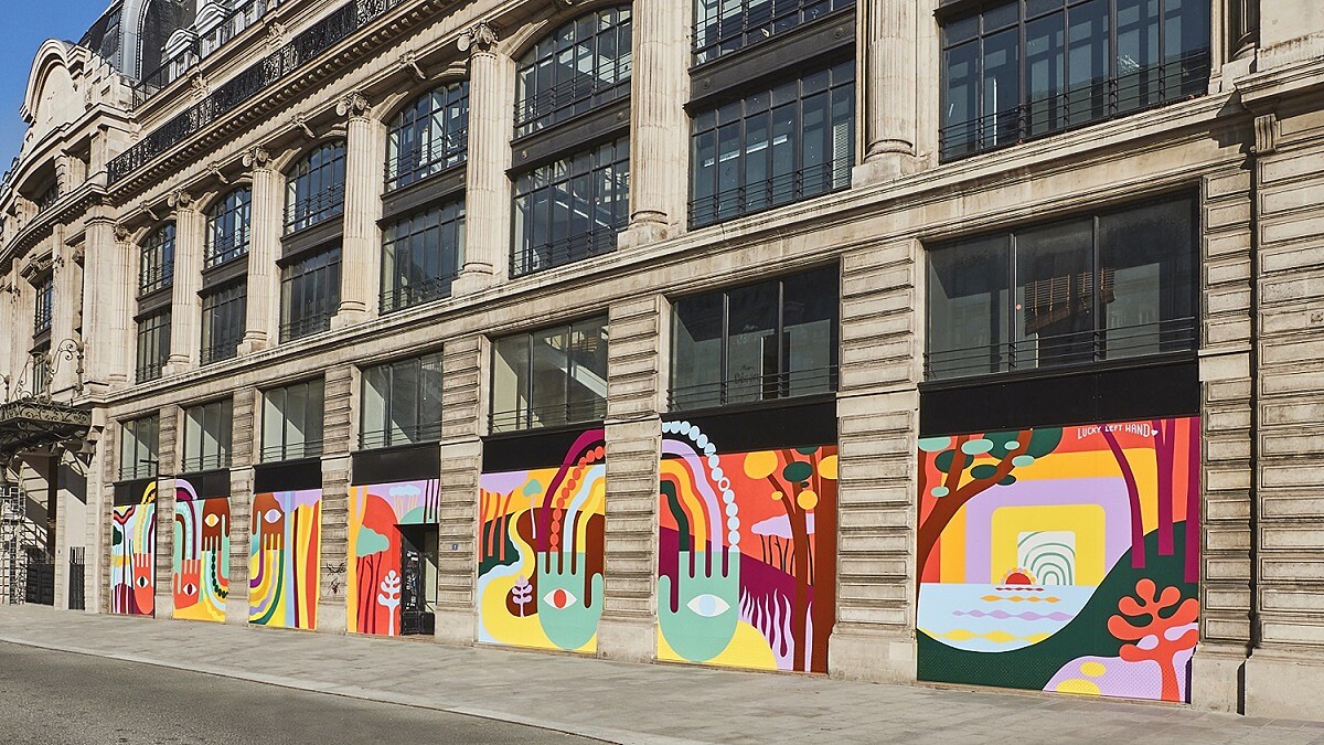 早在1920年代,喬治路易威登曾說:「一起讓這條街變成快樂之地。」於是,Louis Vuitton邀請藝術家Luckylefthand,在這個緊繃的時期,替位於新橋路的LV巴黎總部建築物換上新面貌,運用9種繽紛飽和的色系,創作積占280平方公尺,14幅畫作購成的壁畫牆。