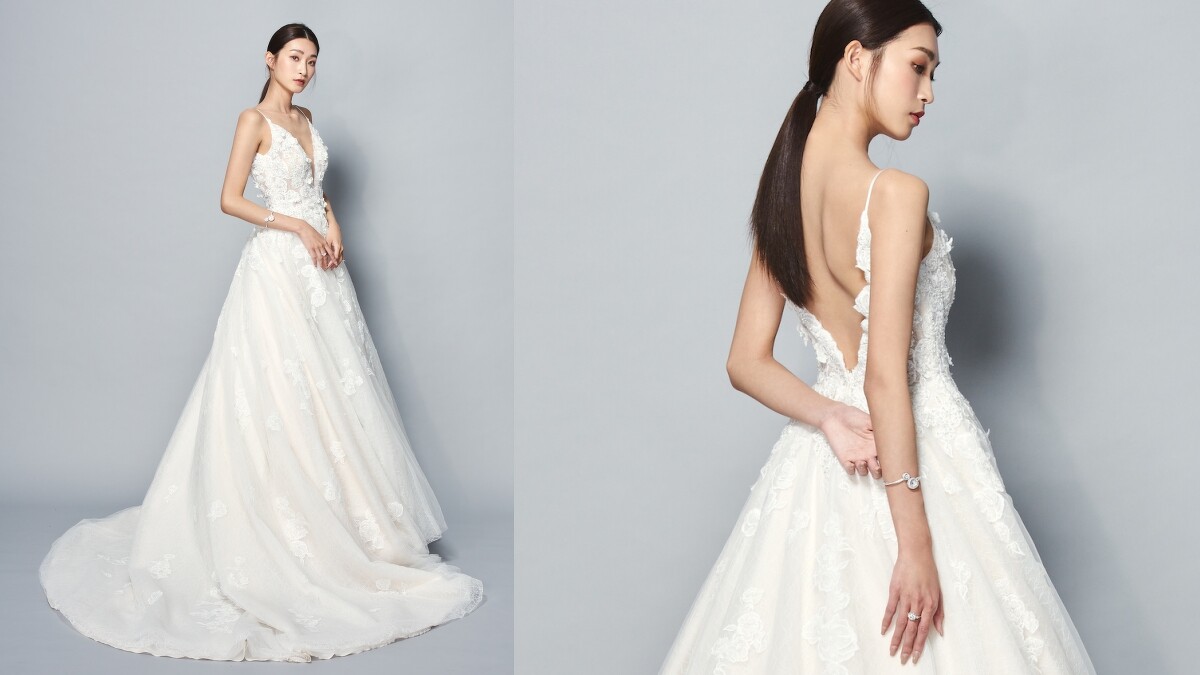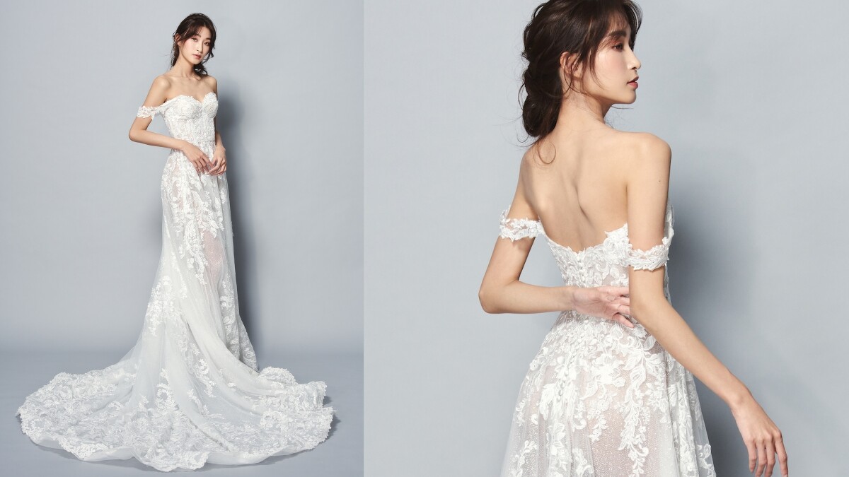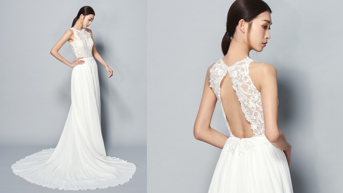透過削肩剪裁,Jasmine Galleria將女性的優美骨感唯美體現。上半身的精緻蕾絲面料,配上下半身柔和飄逸的雪紡白紗,共組氣質滿點的仙女樣貌,轉過身後,挖空的設計則帶出適當的性感氛圍。