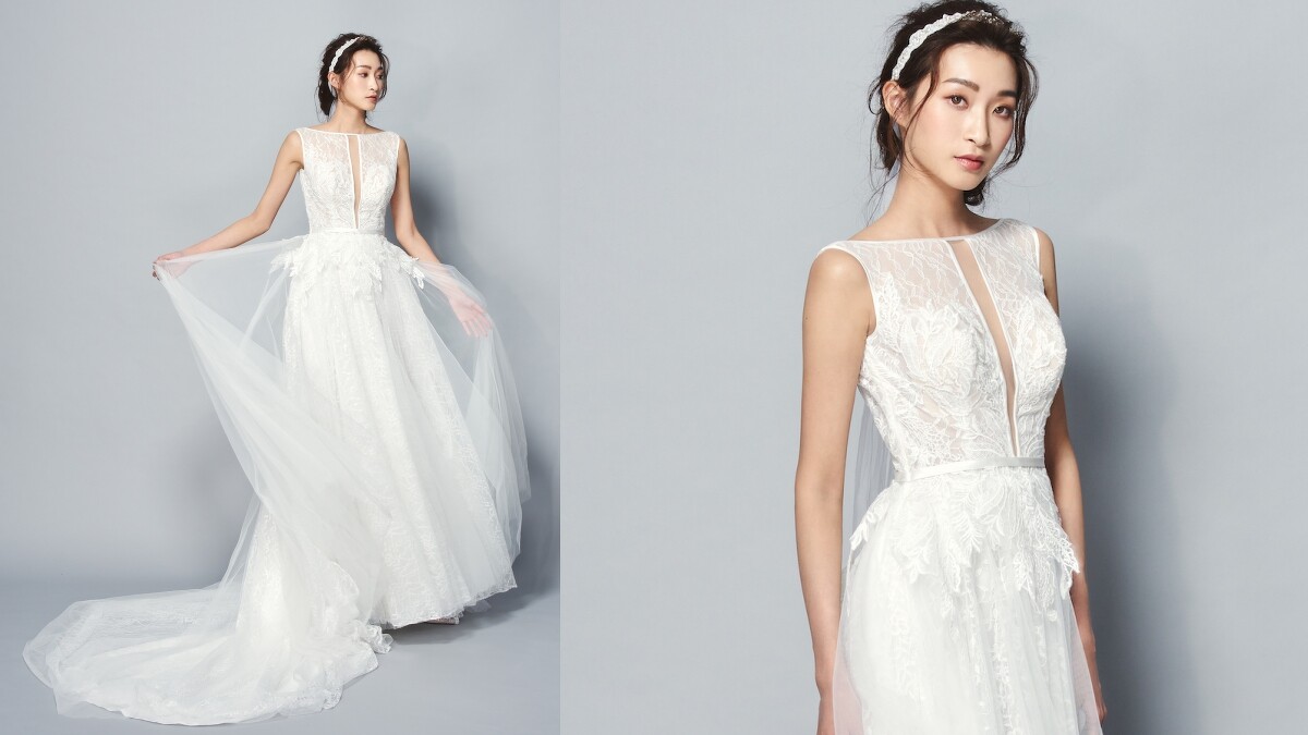 優雅滿分的船型領也出現在了Jasmine Galleria 2020秋冬系列中!從上身延伸到腰間處的蕾絲,以懸空的縫製手法打造出3D的浪漫效果,而層疊在下的透紗和蕾絲,則相互交織共同綻放精靈般的甜潤氣息。
