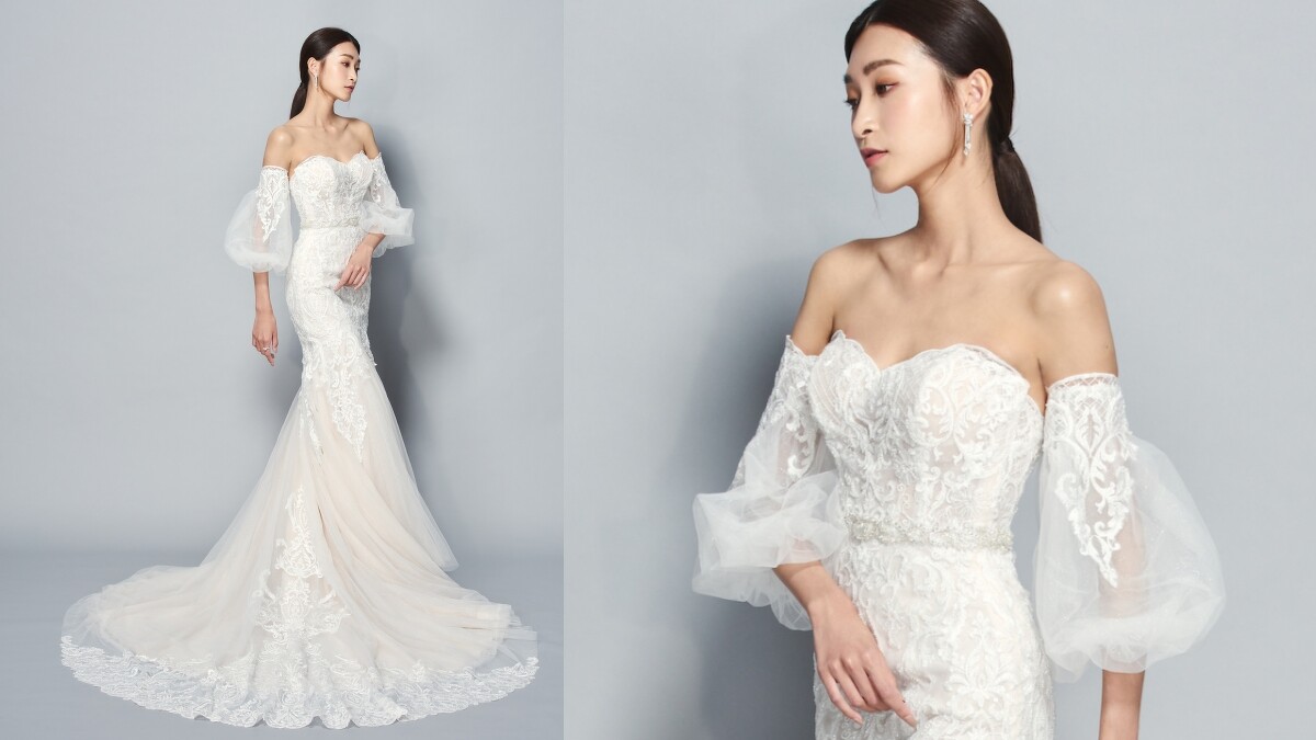 喜愛歐式復古風情的絕對會喜愛這件心型領澎袖婚紗。不僅將女人的胸線完美刻劃,下身更以貼身的魚尾裙剪裁勾勒婀娜的迷人曲線,此外,手臂上的蕾絲透紗澎袖更替整體增添典雅韻味。