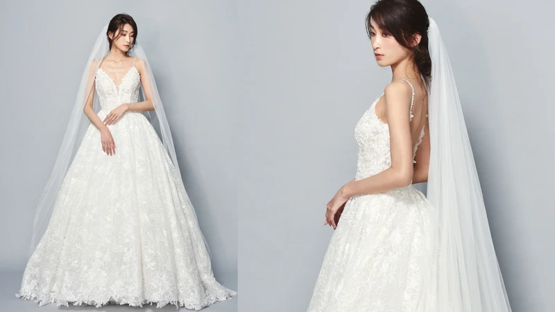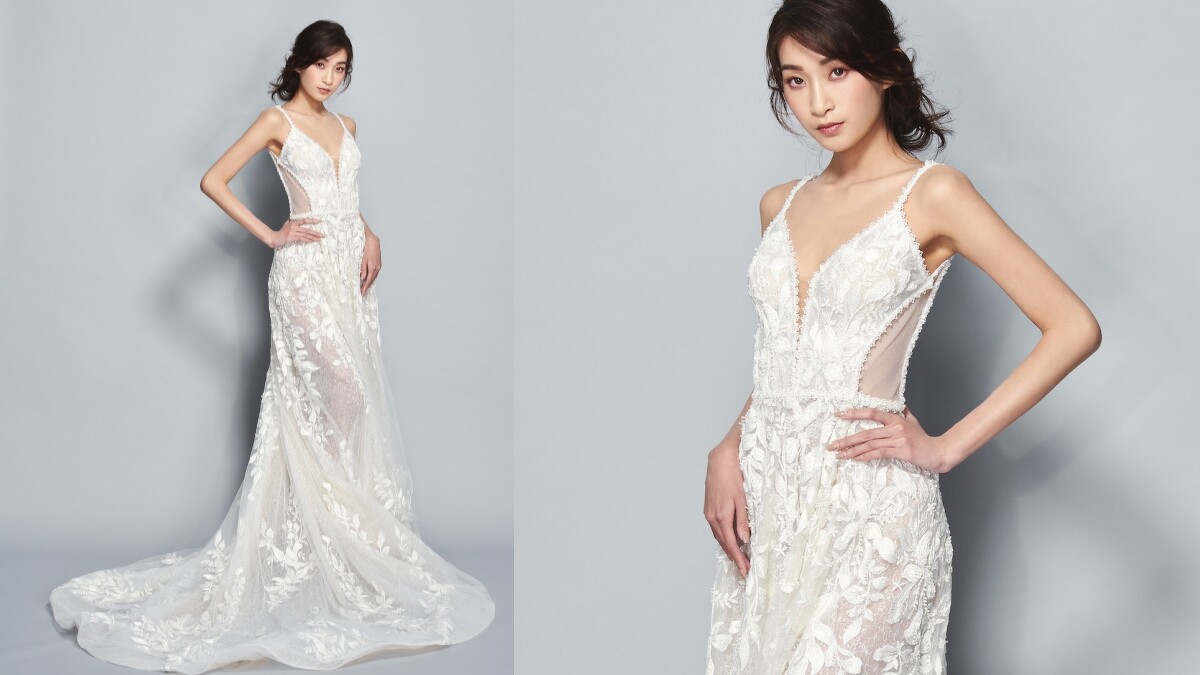 在找尋大器且精美的婚紗嗎?那麼這件擁有深V領的細肩帶婚紗,其拖曳的A字澎澎裙擺絕對能滿足你的期望。仔細看,上頭縫以的立體花卉刺繡不但細緻精美,同時增添了靈動的氣質。