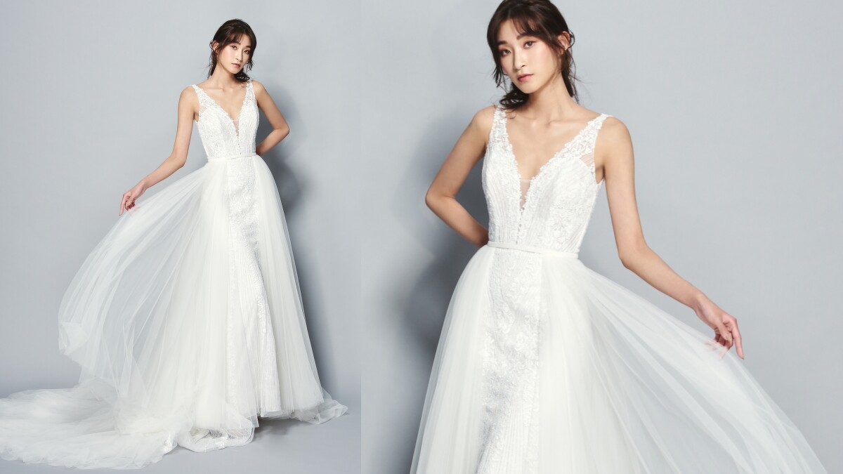隨著一衣兩穿的婚紗趨勢逐漸受到準新娘們的歡迎,Jasmine Galleria也在2020秋冬系列中設計了一件可自由拆卸紗裙的婚紗:未拆卸時充滿浪漫的公主氣質,拆卸後則幻化成典雅的淑女形象。
