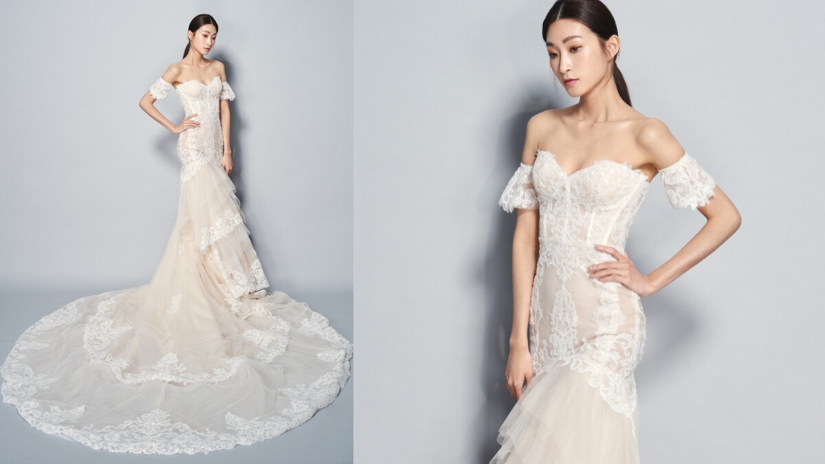 偏愛華麗款的新娘們,則可參考這件由層層紗裙堆疊而起的蕾絲婚紗,同時,魚尾裙擺的剪裁則免去了視覺上腫胖的困擾。此外,除了前款那可自由拆卸的裙擺,活動式的小喇叭袖設計也替新娘們的嫁紗注入別具的時尚風貌。