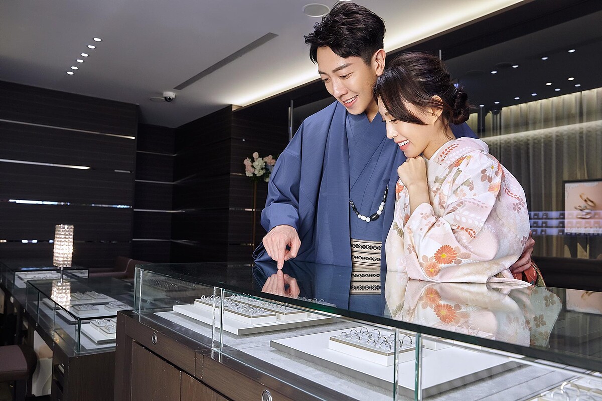 以日本女性最正式華麗的和服「十二單」為設計概念,有如兩人在春日月光下相依翩翩起舞散發的華麗歡愉光芒,佐以柔和優雅的線條及鑲嵌7顆美鑽的設計,讓戀人們可展開下一段人生的浪漫篇章。