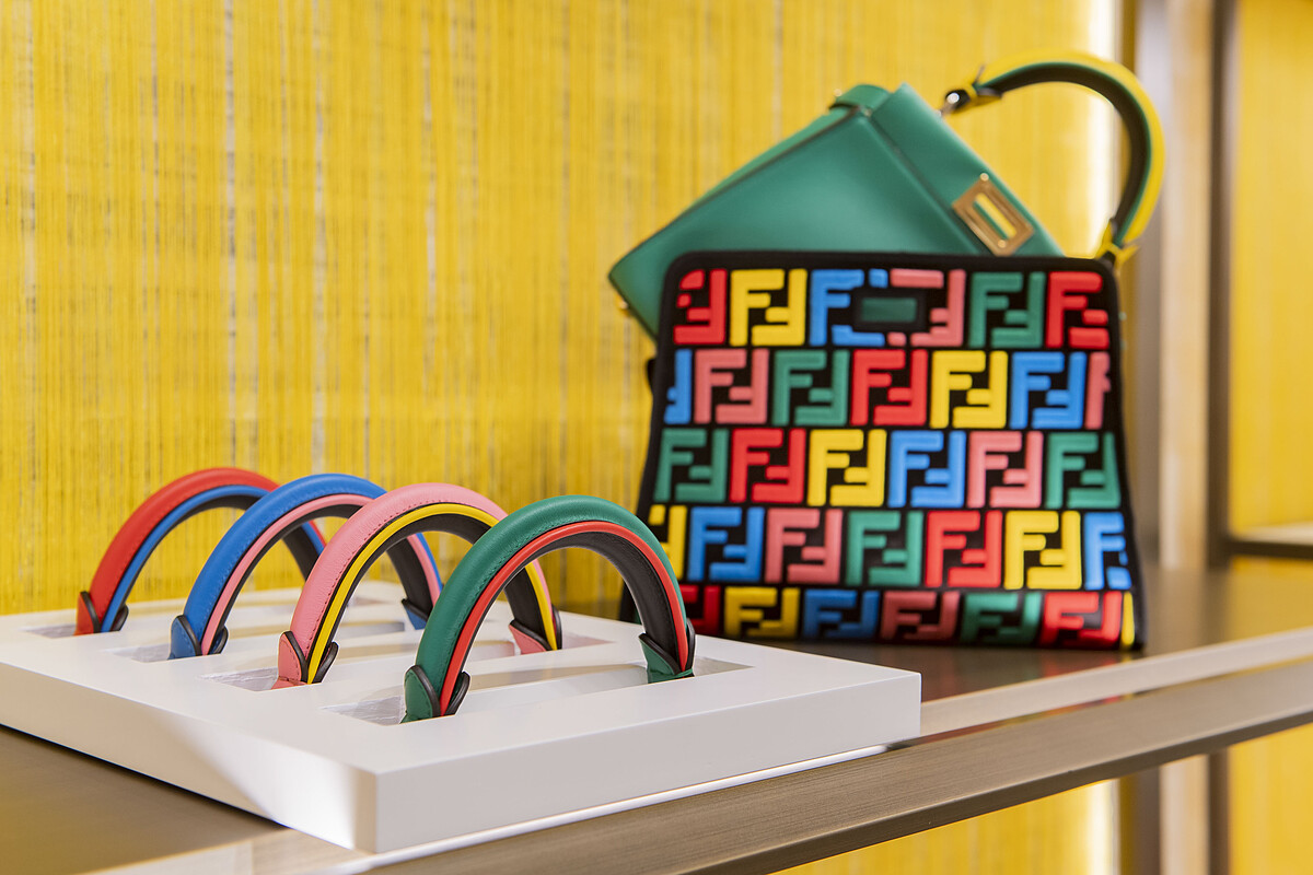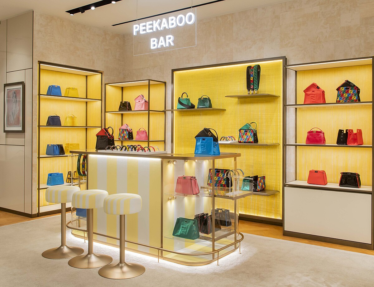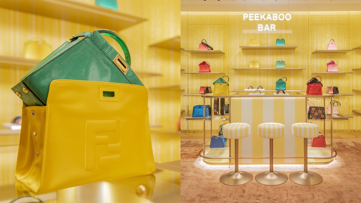 走進此次巡迴的指定專賣店,會看到高掛 Peekaboo Bar 的牆面,讓妳快速找到客製區域。Peekaboo Bar 如其名,Fendi 透過這個概念營造一股有如 Cafè 般的感受,擺放咖啡店會出現的高腳吧台椅,烘托這股悠閒氛圍。
