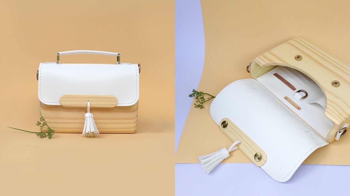不同於其它包包品牌只單純只用布料、皮革製作包包,Woodview大膽創新加入木材工藝,品牌最新推出的奶油白方形木頭斜背包,就是在堅硬的外型加入柔軟的皮革材質,並點綴上流蘇設計,為包包增添趣味性,而手袋中的夾層設計也不馬虎,縫製多格夾層可以整齊放置物品。(Woodview奶油白方形木頭斜背包,NT2,057)