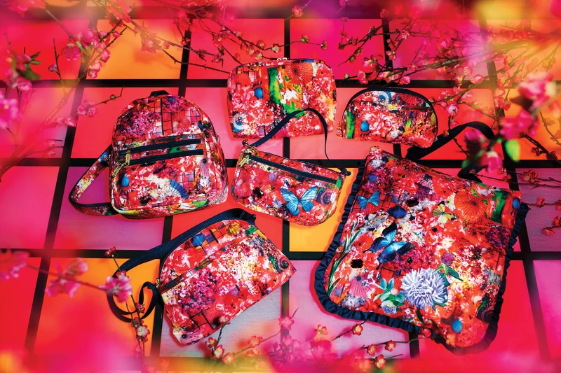 全新Mika Ninagawa X LeSportsac系列,採用蜷川實花標誌性濃豔飽和的花卉,搭配櫻花、紙傘與燈籠等日式風格元素,完美體現東洋風韻。此外,全系列包款以海棠紅為主色調,結合綠松石色內裡,展現濃郁又奔放的對比,而外觀的印花更添加蝴蝶與立體彩色寶石,且配置金色TOKYO字母拉鍊,為整體設計賦予異國質感,背在身上絕對渲染奪目!