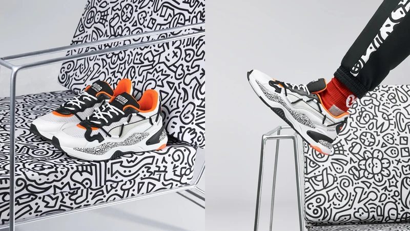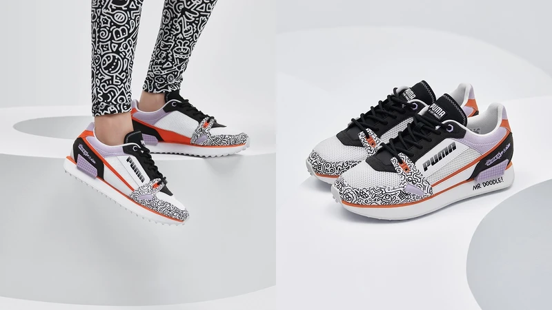 Puma X Mr.Doodle聯名系列所推出Puma RS-2K by Mr.Doodle鞋款,以鞋帶化身為筆觸於鞋側間遊走,中底則搭配Mr. Doodle著名的玩趣塗鴉,並利用皮革飾片在鞋面上畫出搶眼箭頭,展現搞怪風趣的風格。