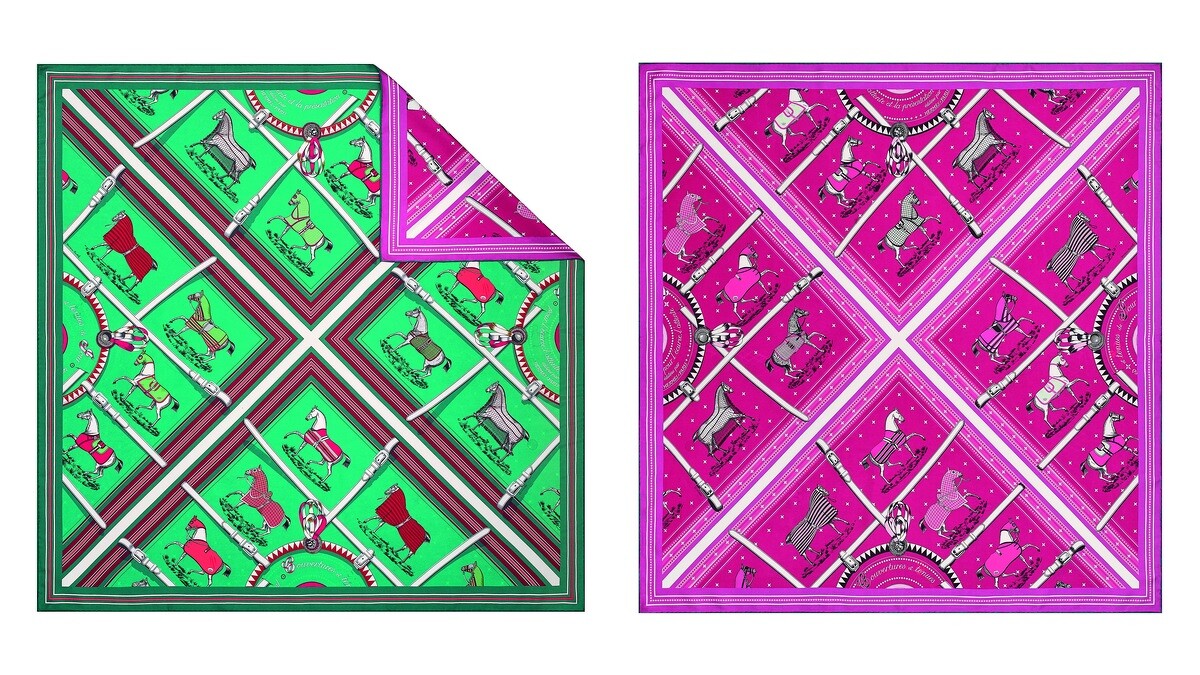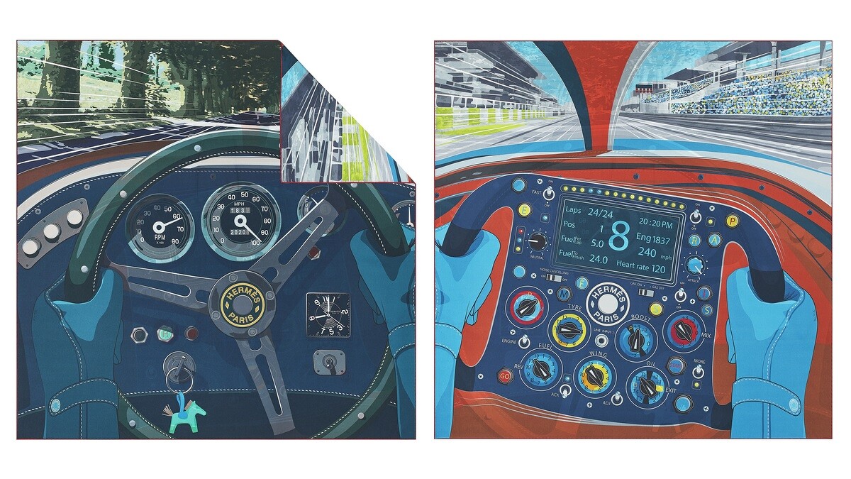 另一款Formule chic斜紋真絲方巾,同樣擁有雙面印花,但在面料設計上,這款絲巾則採用Dimitri Rybaltchenko所創作老式汽車與一級方程式賽車的兩種圖紋。(NT20,400)