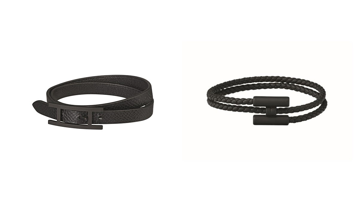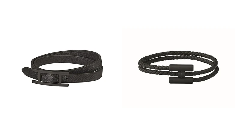 除了Collier de Chien手環外,Hermès更推出Behapi So Black雙圈小牛皮手環與Tournis Tressé So Black雙圈小牛皮編織手環,以Swift小牛皮材質打造,搭配霧面黑PVD金屬搭扣。 (左NT12,300、右NT15,200)