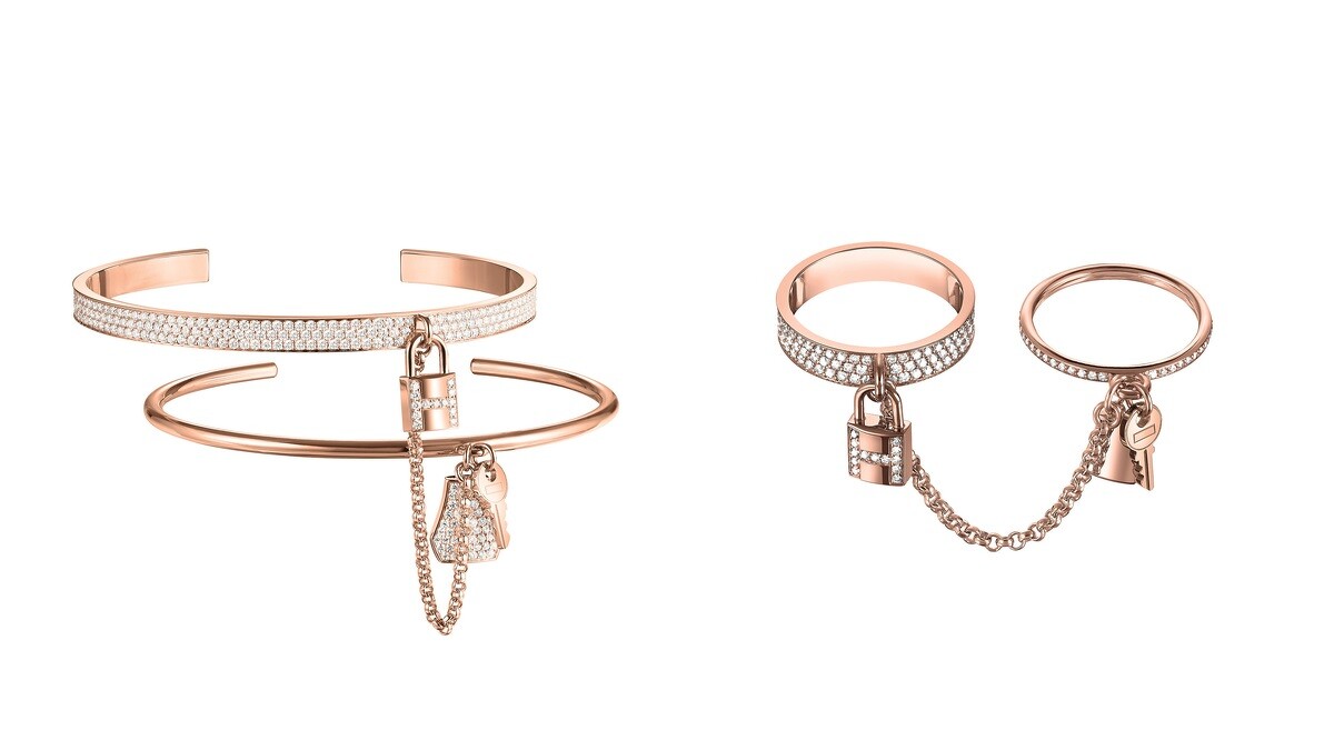 這款Kelly Clochette系列飾品,將原先用於保護Kelly包掛鎖鑰匙的Clochette皮革套,重新演繹,選用玫瑰金配色,配置於珠寶設計上,向Hermès鏈條工藝致敬,其俏皮大膽的佩戴方式,更是突破珠寶領域思維。(左NT1,066,000、右NT380,700)