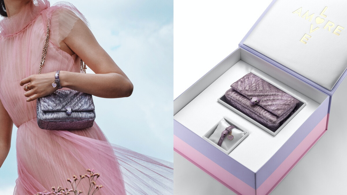 每年七夕皆會打造專屬獻禮的寶格麗,今年也不例外,以浪漫的粉嫩色系,營造出七夕的甜蜜戀愛氛圍。品牌特地打造2020七夕特別款小牛皮Cabochon肩包及絲巾套組,標誌性的蛇頭搭扣一改往日的魅惑之感,大膽選用應景情人節的粉色和紫色相配。另外,寶格麗也推出七夕特別款水蛇皮Cabochon迷你包及手鏈套組,金屬質感的水蛇皮Cabochon迷你包,適合出席正式或輕鬆場合,位女孩穿搭增添亮點。