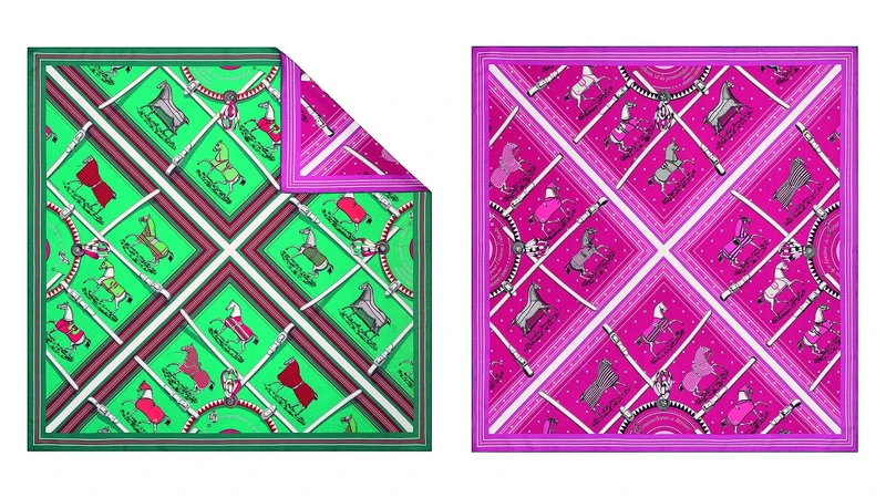 這款絲巾採用雙面斜紋印花,以新穎的技巧,重新演繹品牌經典Couvertures et tenues de jour圖紋,更於背面搭配頭金豐個的單色設計。(NT20,400)