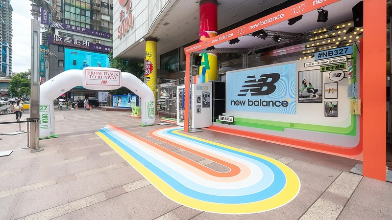 New Balance 327型走街頭快閃店從台北最熱鬧的東區展開,聳立於街頭的汽球拱門區為起點,以繽紛的傳奇馬拉松賽道區延伸登上時尚封面拍照區,左側以紐約地鐵標誌、都會街景呈現美式街頭樣貌,再搭配右側具有在地精神的復古旋轉燈與招牌裝置,完美呈現New Balance元素。
