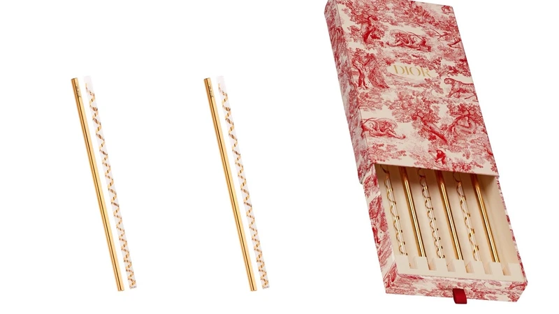 將Dior創意總監Maria Grazia Chuiri所打造的森林、動物圖騰作為靈感推出絕美「Toile De Jouy」環保吸管組,紅、白色有如水墨畫般的外包裝,裡頭則有6根手工製作的環保吸管,包含奢華金色、透明圖紋兩種款式,售價訂為120歐元。