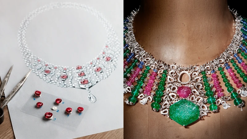 鑲嵌63.21克拉的雕花哥倫比亞祖母綠、22.41克拉的雕花緬甸藍寶石、16.93克拉的雕花緬甸紅寶石、雕花祖母綠、藍寶石和紅寶石,祖母綠和藍寶石圓珠、瓜形切割紅寶石圓珠、凸圓形切割藍寶石、圓形明亮式切割鑽石。以大自然為靈感的「水果錦囊」(Tutti Frutti)風格,在這件作品中以紅寶石、藍寶石及祖母綠圓珠構成經典的紅色、藍色和綠色對比配色,帶出主題。飾有「Godrons」圓紋裝飾或光滑的寶石從小到大排列,為項鍊帶來流暢動感。
