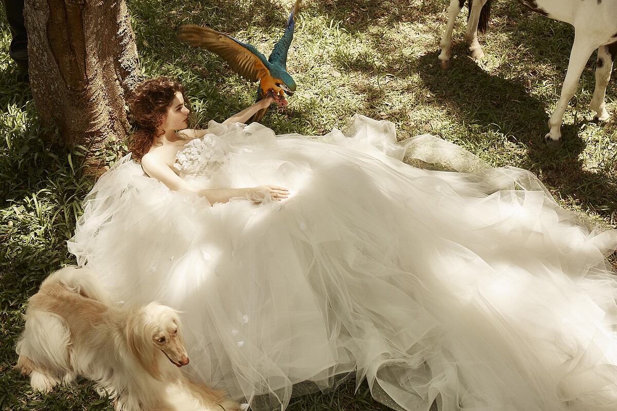 宛如童話故事《愛麗絲夢遊仙境》裡的主角Alice,該件絲緞禮服不僅有著少女般的甜潤稚氣,高腰封剪裁的設計與衣袖上的蝴蝶結裝飾巧思,更巧妙帶出Alice古靈精怪的童趣特質,大方又不失性格。