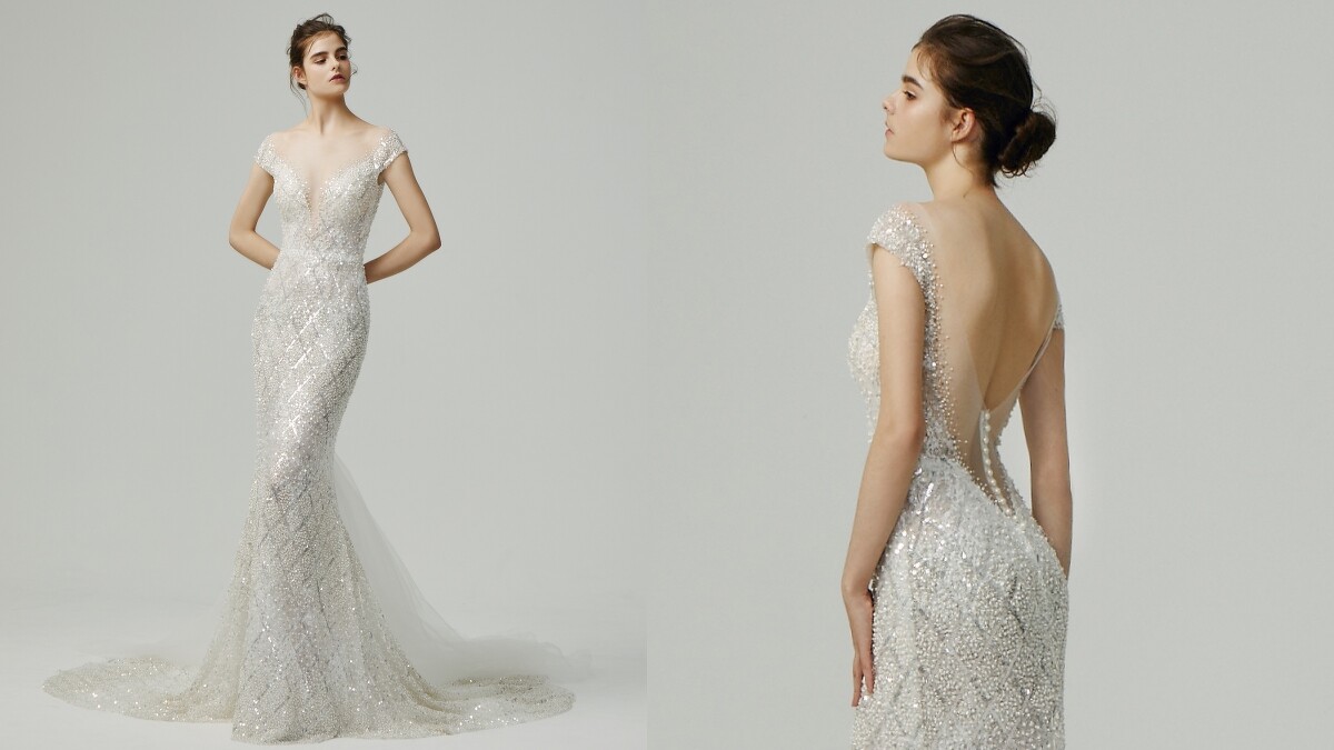想走性感風的話,則可參考這一件裸縫菱格狀的珠工手藝禮服。除了有120度的闊形肩線,貼合身型的魚尾裙擺也勾勒出女性撫媚的一面,尤其一路從臀部延伸至腰間的低腰珍珠排扣設計,更將優雅的背部突顯而出。
