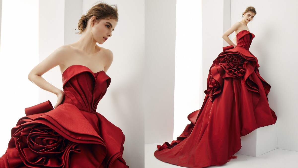 光聽名字就知道,這件名為Poppy的大紅色禮服一定是件滿載熱情與希望象徵的婚紗。透過精湛的立體剪裁技術,Sophia Ritz將猶如玫瑰花盛開時的光彩樣貌轉化在設計上,並利用收腰倒V的馬甲胸線,增添視覺上的豐胸塑形效果。