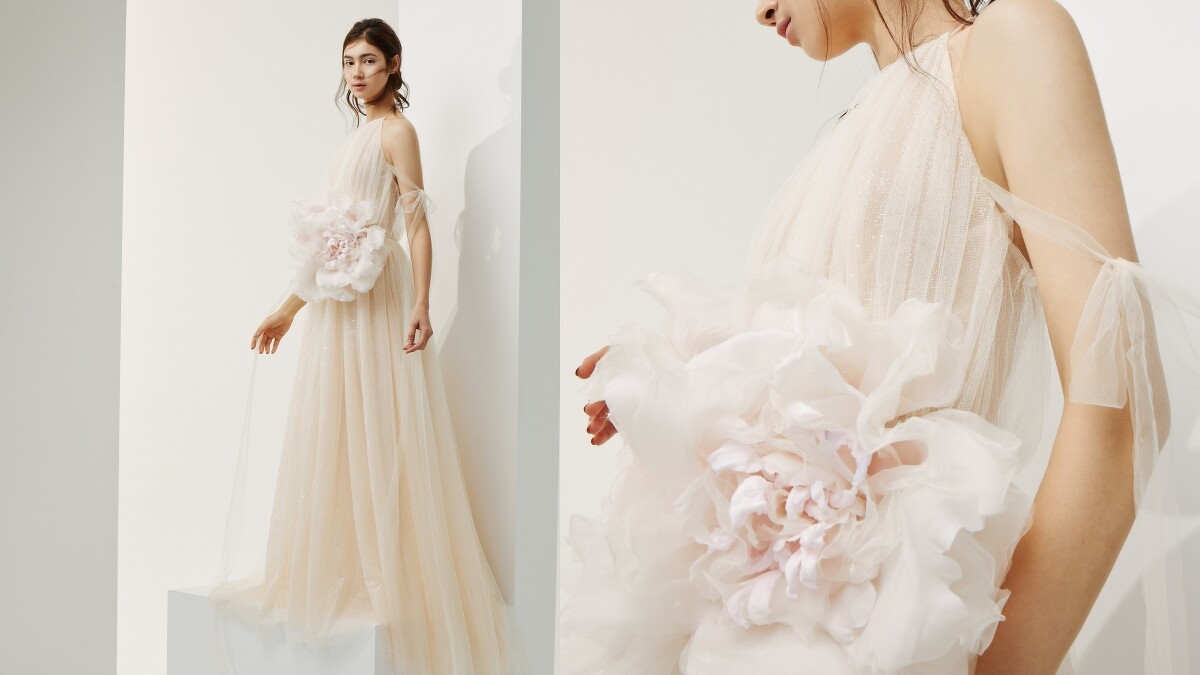 若你在找尋一件散發希臘神話女神氣質的婚紗,那麼削肩+落肩衣領設計的Agata透紗禮服便是你的最佳選。將帶有銀色光澤感的粉色布料,外罩上暖膚色單層網紗,呈現宛如午後陽光灑在肌膚上的溫暖柔和色澤,而腰處上的立體手工仿真花配飾則替再佐上甜蜜焦點。