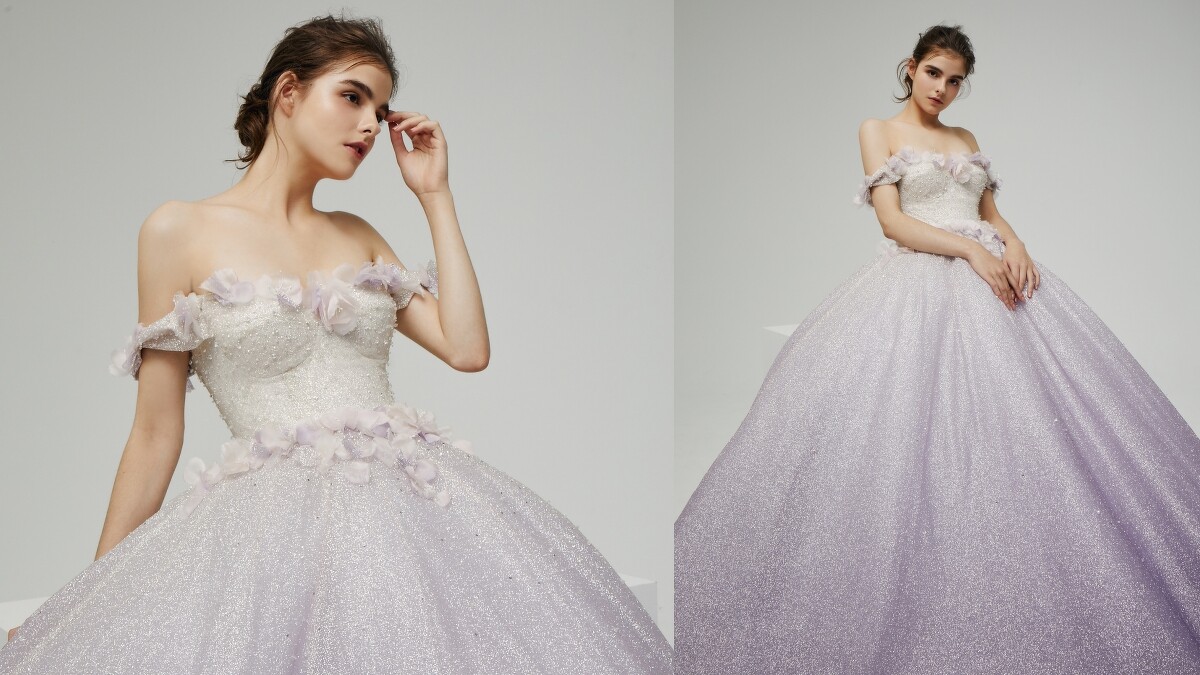 採用源自義大利的亮粉漸層紗,這件有著一字領和A字裙擺的婚紗,以由上而下的銀白至優雅紫漸層色為主重點,上身再綴以立體烏干紗花朵,展現甜美可人的氣質公主形象。